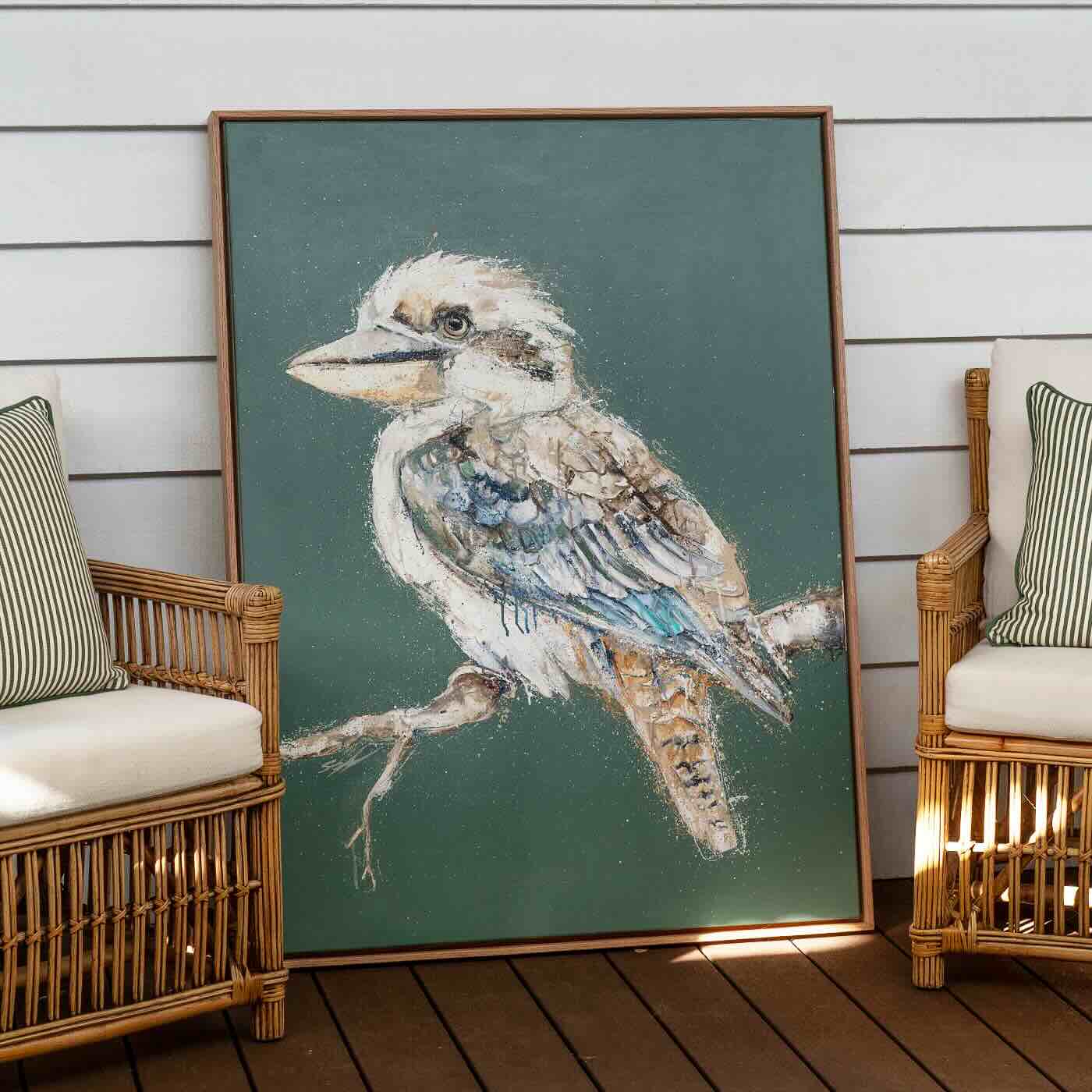 Perched and Patient captures the distinctive charm and attitude of the Australian Kookaburra. Painted in acrylic on a poly-cotton blend canvas, this original artwork highlights the bird’s serious gaze and readiness to catch the early morning, set against a soft, green background. Professionally stretched and framed in oak, it is ready to hang, bringing character and presence into your home, office, or gallery space.