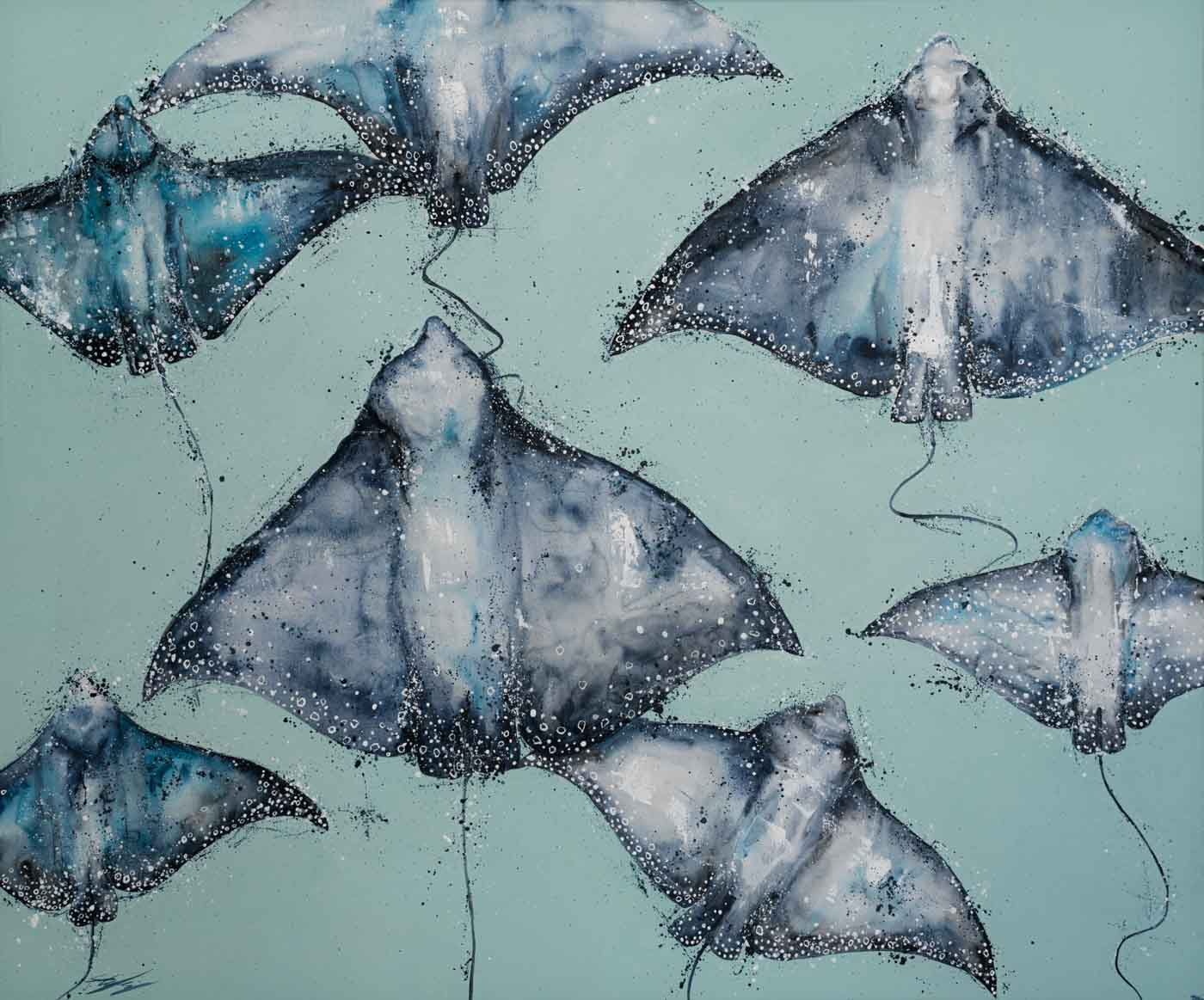 An exact replica of A Sea of Spots – an acrylic painting by Stephanie Elizabeth, featuring elegant eagle rays drifting across a soft teal sea. Their spotted wings move in perfect formation, capturing the fluid rhythm of underwater life. Calm, composed, and quietly mesmerising.