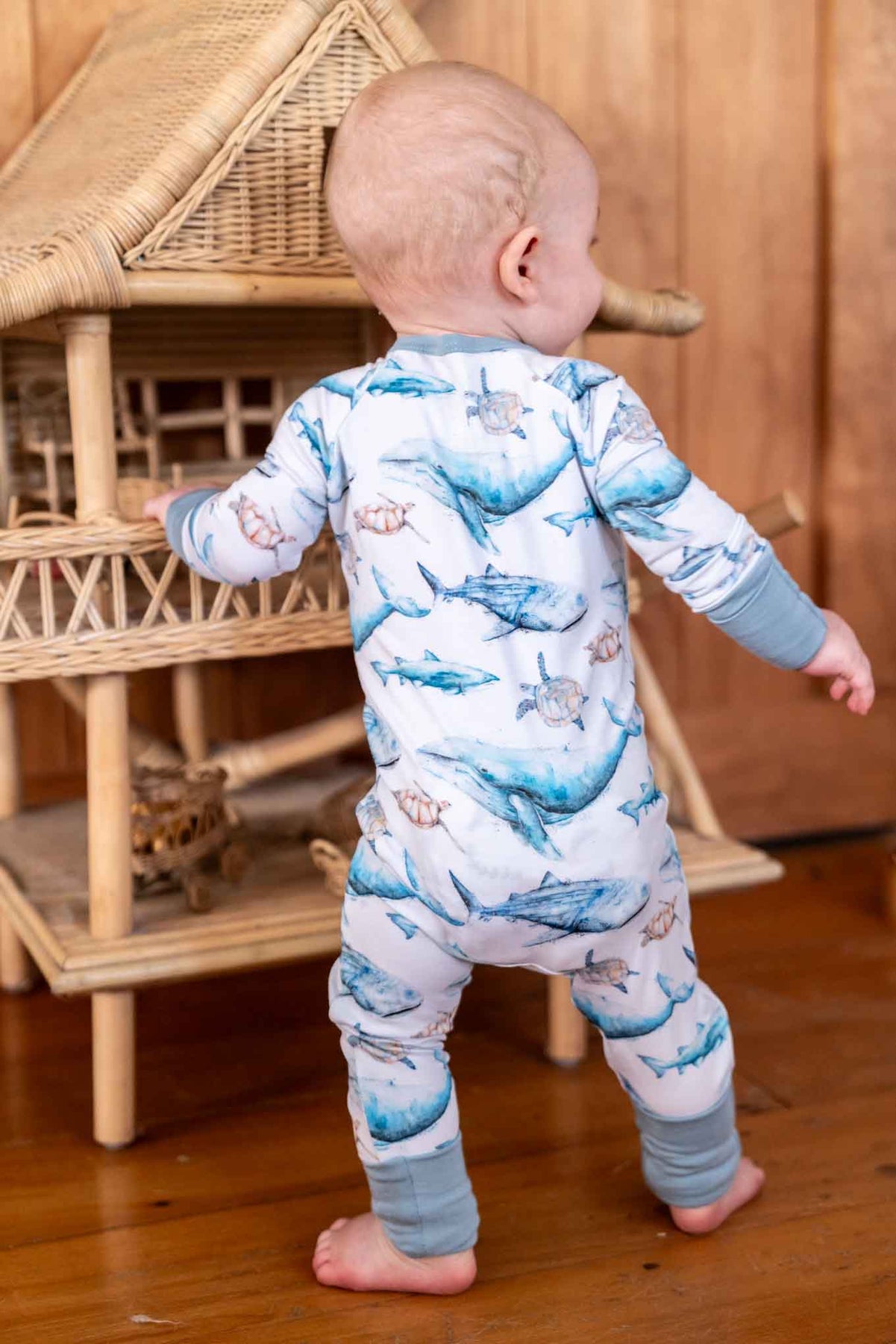 Sea Life Baby Onesie – humpback whale, turtles, sharks - standing back view