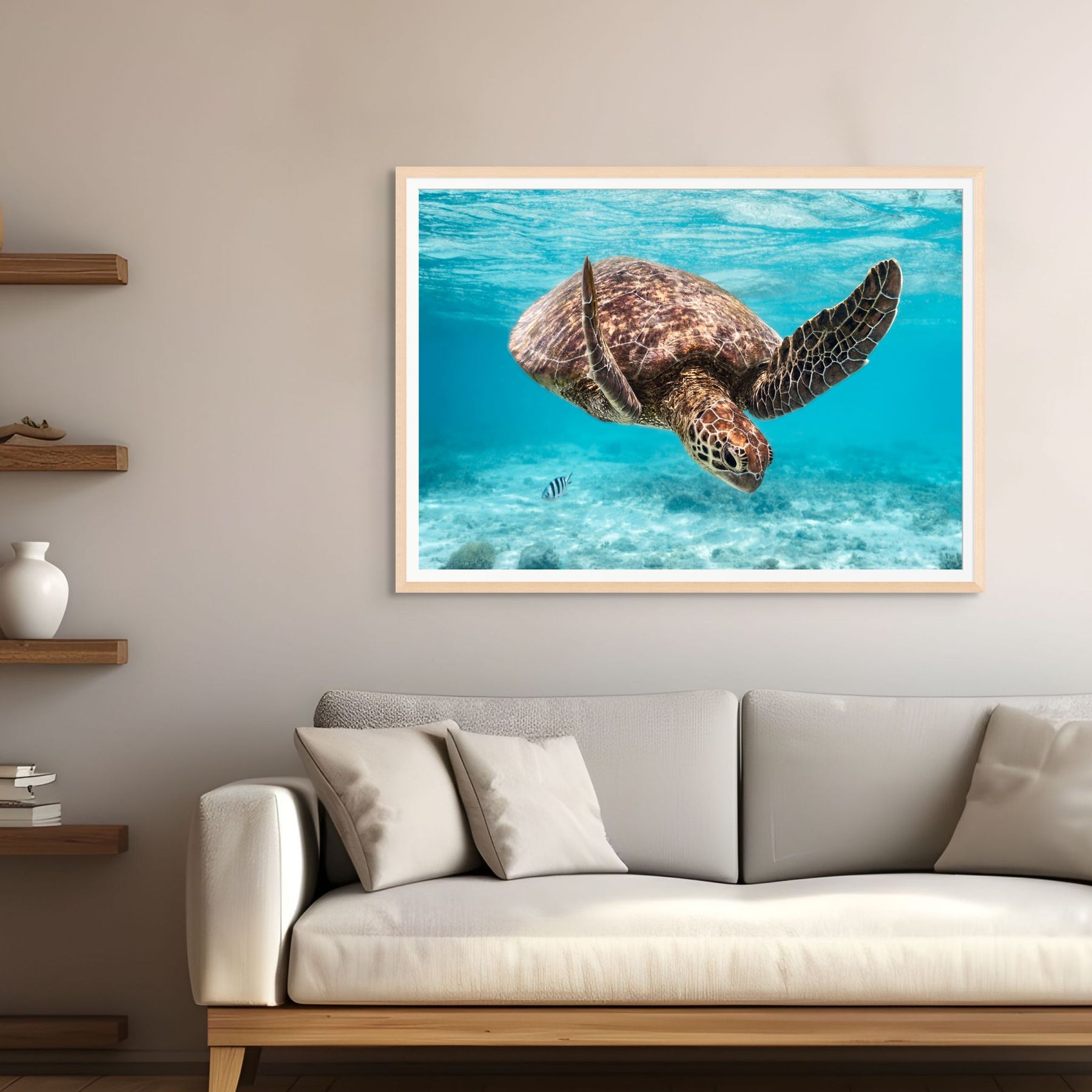 An intimate encounter beneath the waves, A Moment Below features a green sea turtle descending gracefully through clear water, while vibrant reef life moves around it. A tranquil snapshot of ocean life in motion.