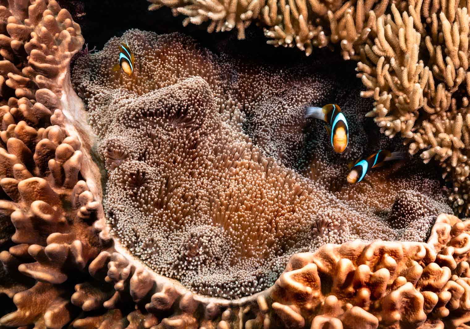 A charming underwater moment highlighting the family dynamics and vibrant colours of these clownfish.