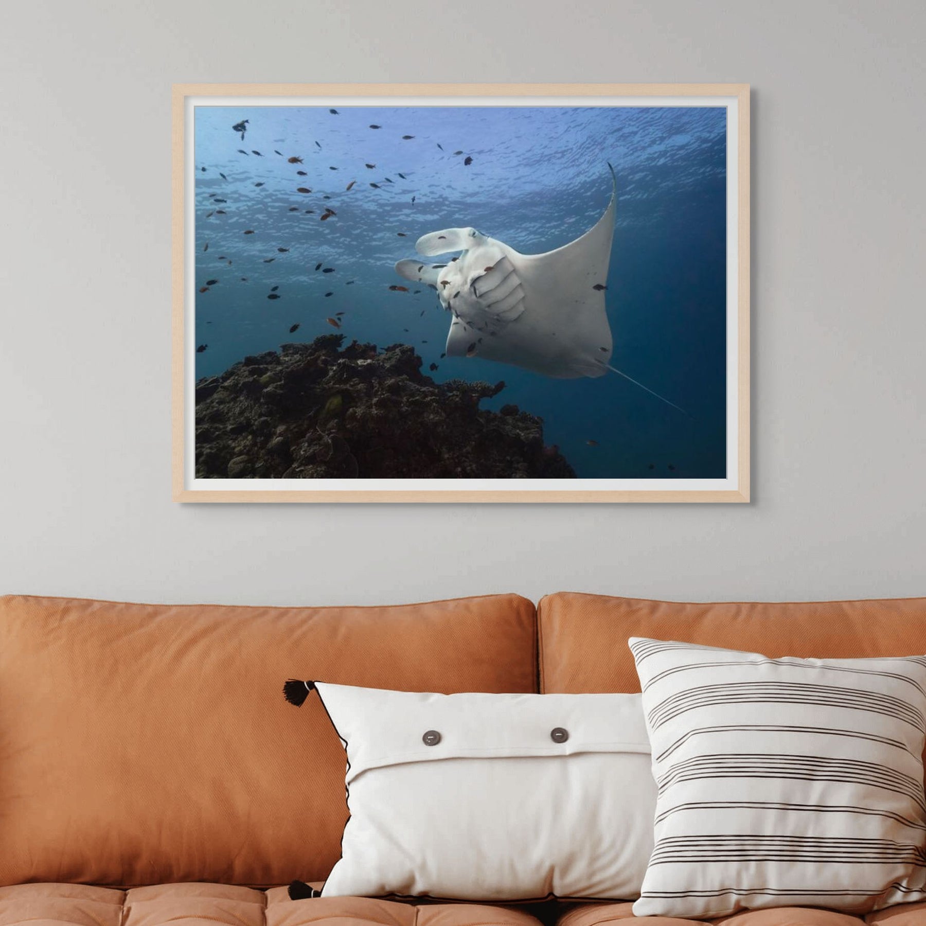 Time & Time Again – Manta ray at a cleaning station with gills fluttering and fish swimming around, underwater scene | Framed Paper Print