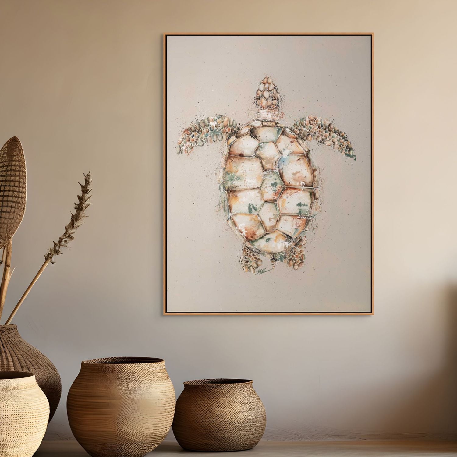 Green captures the majestic beauty of a sea turtle from a top-down perspective, set against a soft beige background. Painted in acrylic on a poly-cotton blend canvas, this original artwork by Stephanie Elizabeth highlights the importance of respecting and protecting wildlife, reminding us of our connection to the planet and all its creatures. Professionally stretched and framed in natural oak, it arrives ready to hang, bringing a meaningful and serene presence to any living space or art collection.