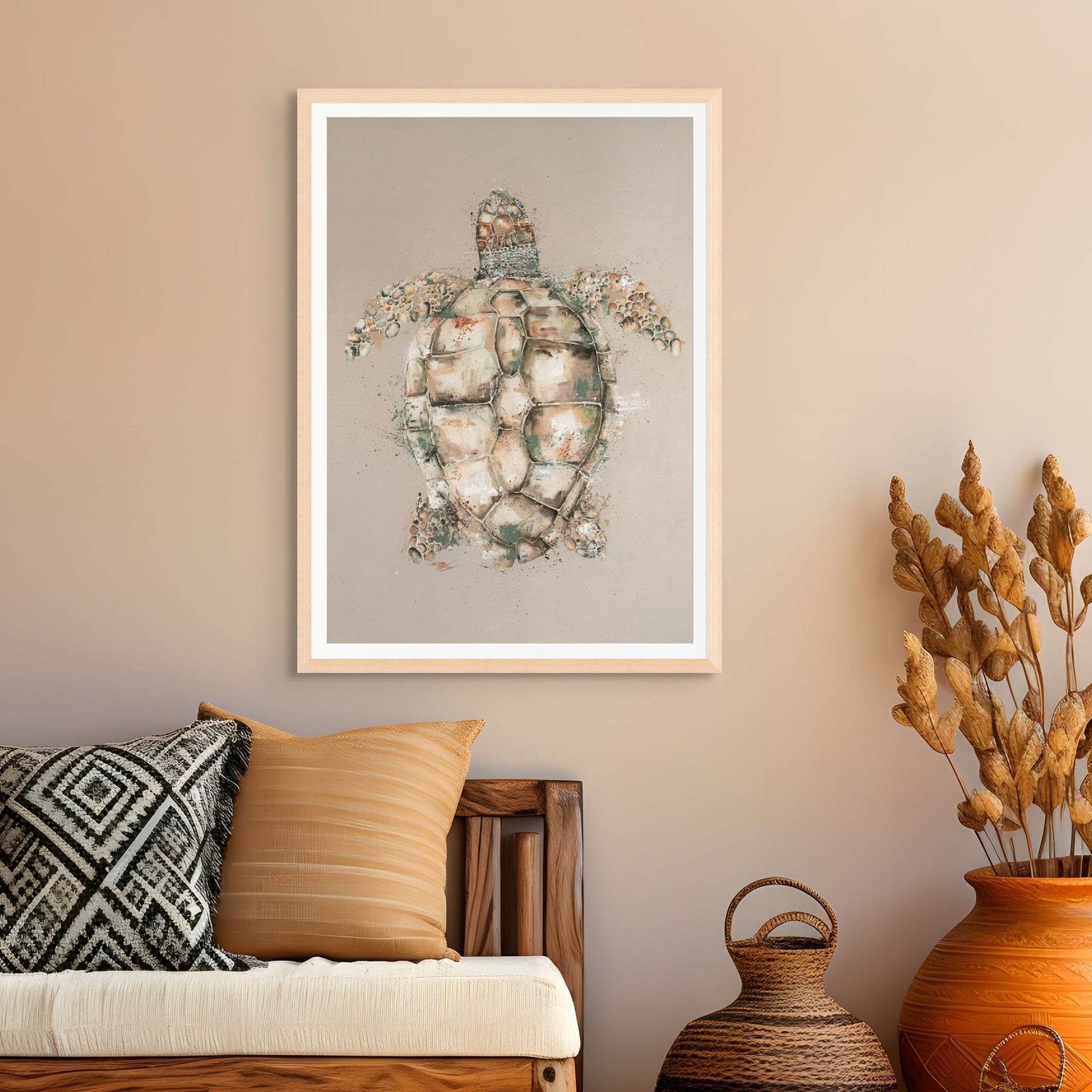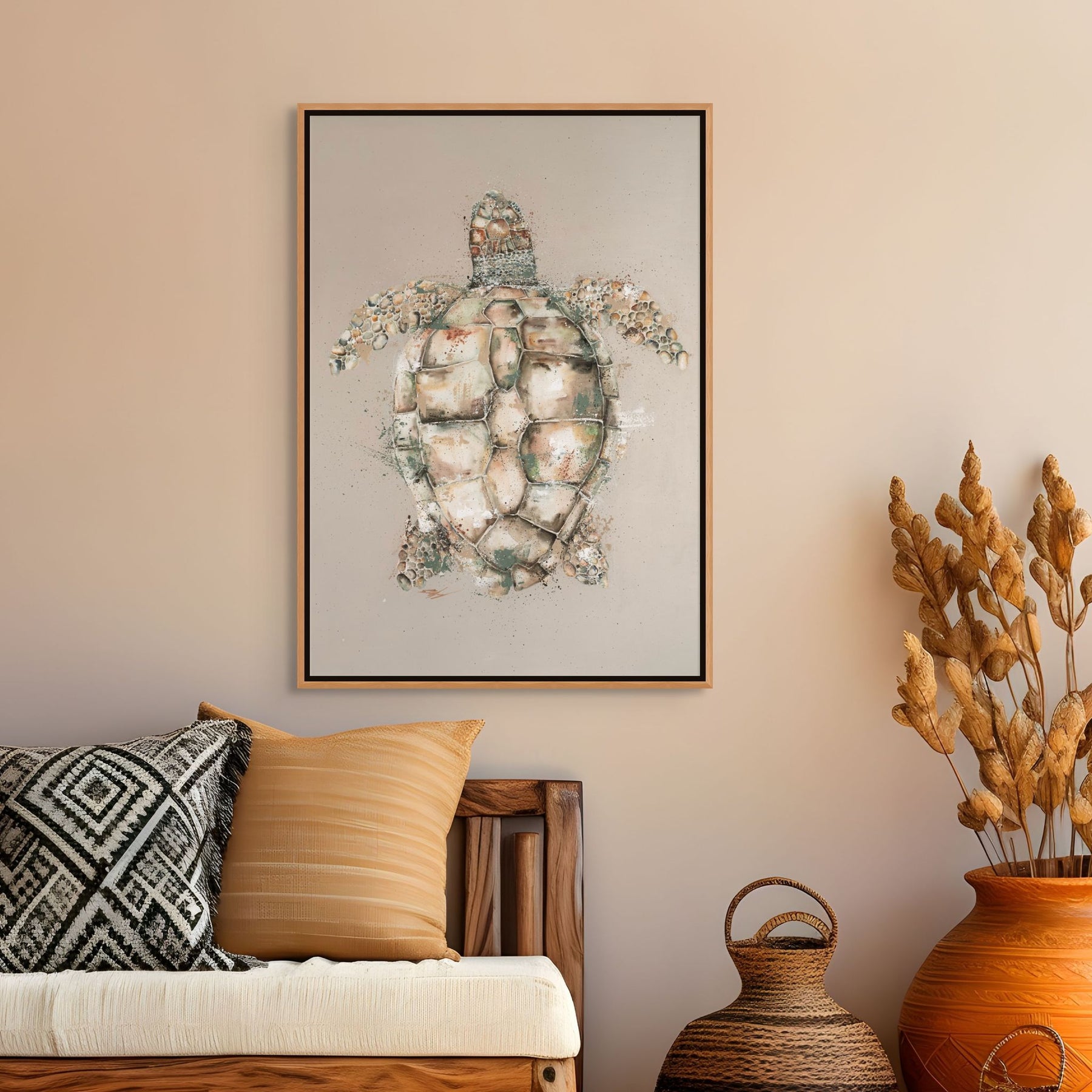 A peaceful and refined portrayal of a loggerhead sea turtle, perfect for coastal or marine-inspired interiors.